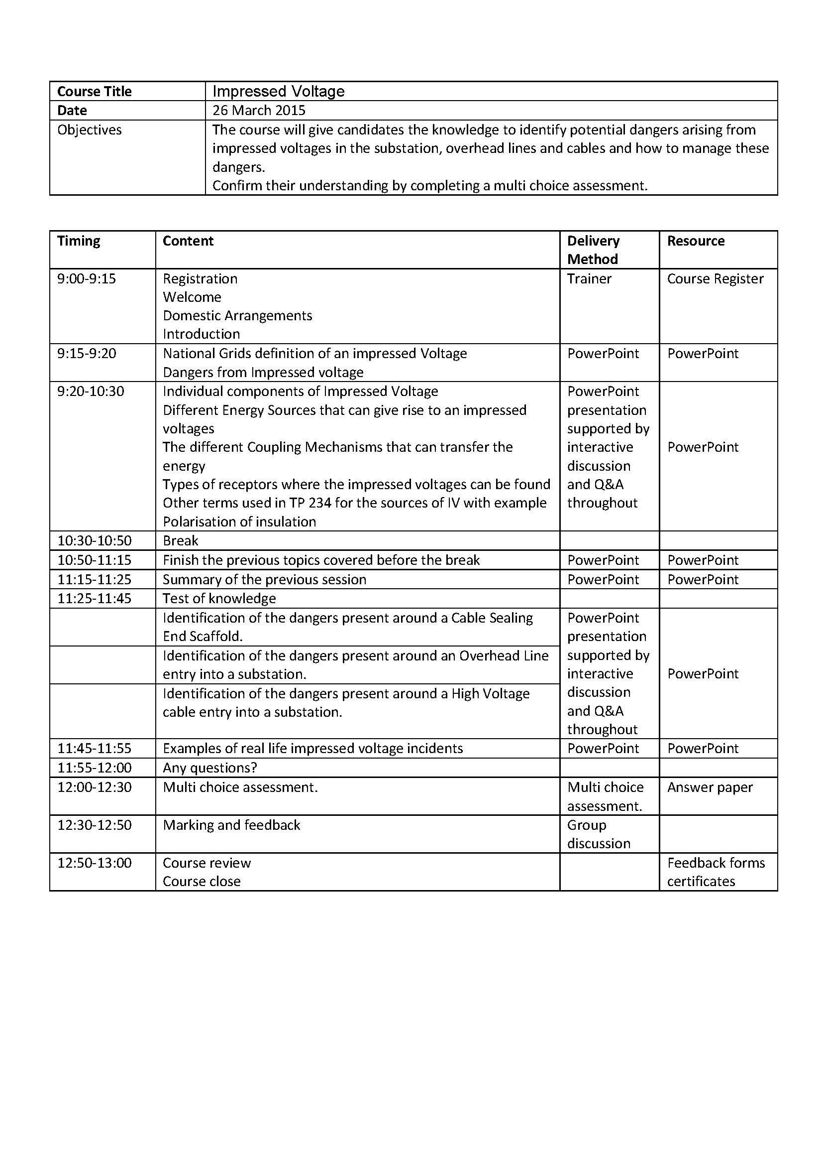 National Grid’s Definition: “Conditions which could cause dangerous induced voltages or currents, difference in earth potential or voltage differences across any break in the conductive path” The Impressed Voltage Course compliments the Safety Rules and National Safety Instructions 4,5 and 24. The pass mark is set at 80% Impressed Voltage