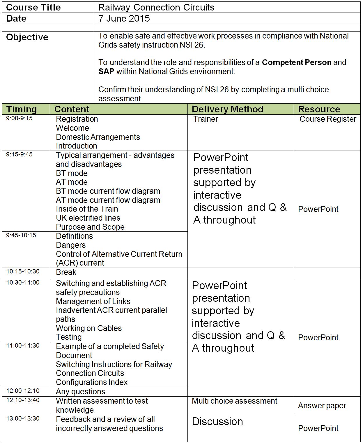 To enable safe and effective work processes in compliance with National Grids safety instruction NSI 26. To understand the role and responsibilities of a Competent Person and SAP within National Grids environment. Note: Words in bold are terms defined in National Grids fourth Edition Safety Rules. Words in italics are definitions found in NSI 26. At the end of the training: